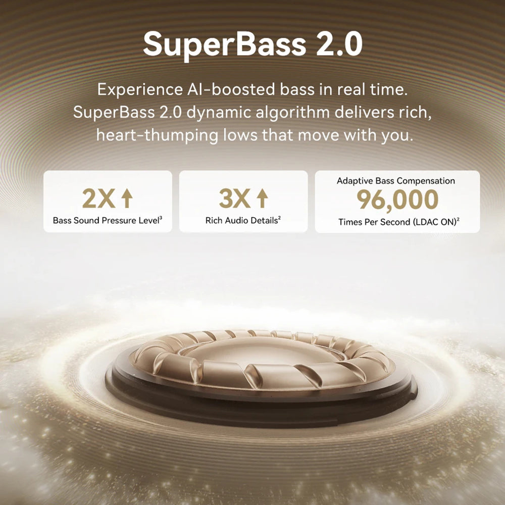 • This setup produces a wide soundstage, and the proprietary SuperBass 2.0 (AI) algorithm adjusts the bass energy in real time.