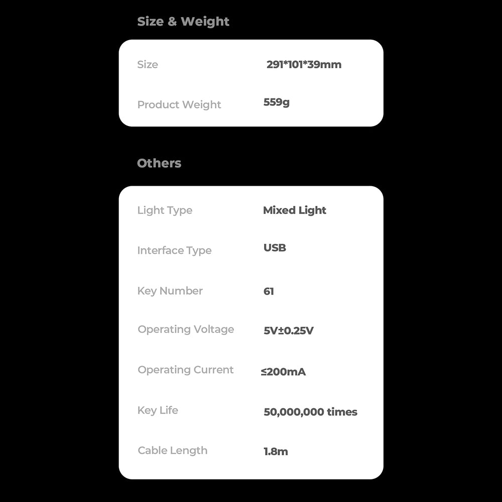 Enjoy a modern keyboard with a compact design, spectacular lights, and durable keys. Order the Havit keyboard now! Compact design and lighting This keyboard combines a modern and compact design with spectacular colorful lights, saving space and adding dynamism to every use. Precision and durability Built for strength and reliability, the keyboard delivers precision every time and eliminates errors on multiple key presses. Specifications: Materials: ABS, polycarbonate; Interface type: USB-C; Operating voltage: 5V ± 0.25V; Operating current: ≤200 mA; Number of keys: 61; Key lifespan: 50,000,000 presses; Cable length: 1.8m; Dimensions: 291 x 101 x 39mm; Weight: 559g.
