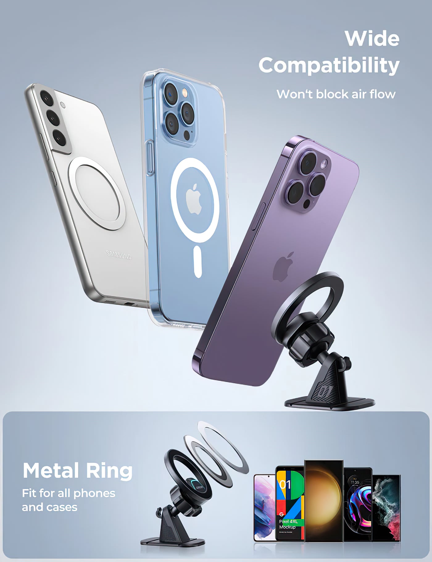 if your phone does not have built-in magnets, simply use the included metal ring.