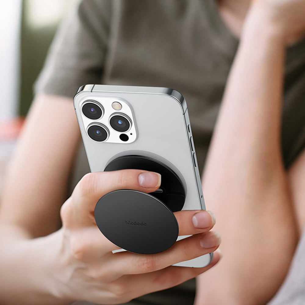Foldable holder that keeps the phone stable on flat surfaces and allows quick switching between grip mode and stand.