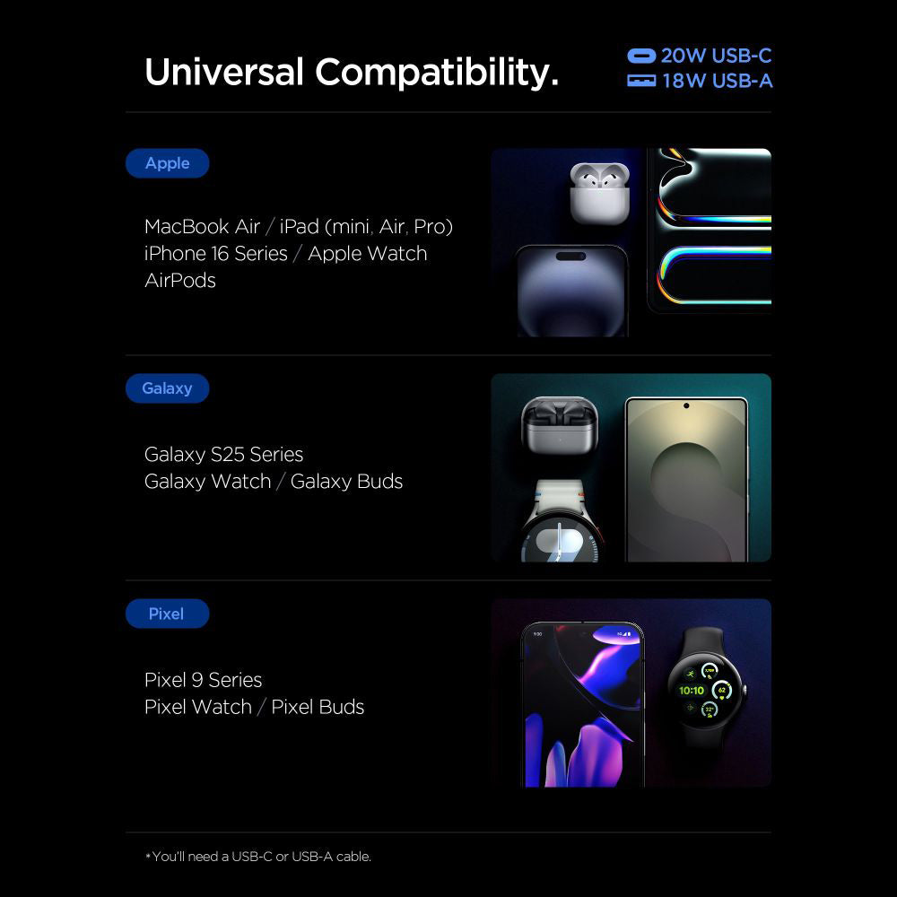 A well-built GaN network charger, remains functional for years. That's why we recommend this high-performance charger with which you can age peacefully. Practical flexibility Spigen integrates 2 distinct ports so you can simultaneously power a modern Type-C device and a compatible USB accessory. Intelligent power management system With "Quantum Boost", this dual charger recognizes the connected device and automatically adjusts the charging parameters. Essential features for a GaN charger The polycarbonate casing ensures an excellent balance between reduced weight, mechanical durability, and efficient passive heat dissipation. Specifications: Material: polycarbonate; Connectors: USB-C, USB; USB-C Power: 20W; USB Power: 18W; USB-C + USB Power: 15W; Compatibility protocols: PD 3.0, PPS, QC 3.0, AFC, FCP, SCP; Dimensions: 28 x 39 x 44mm; Weight: 53g; Compatibility: USB-C devices (universal, iOS, and Android).