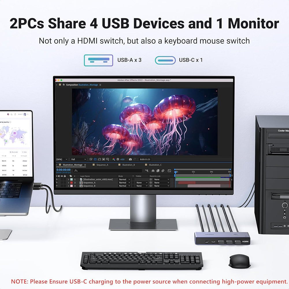 UGREEN CM692 is a switch that allows you to control two computers using a single monitor and four USB 3.0 devices, such as a keyboard,