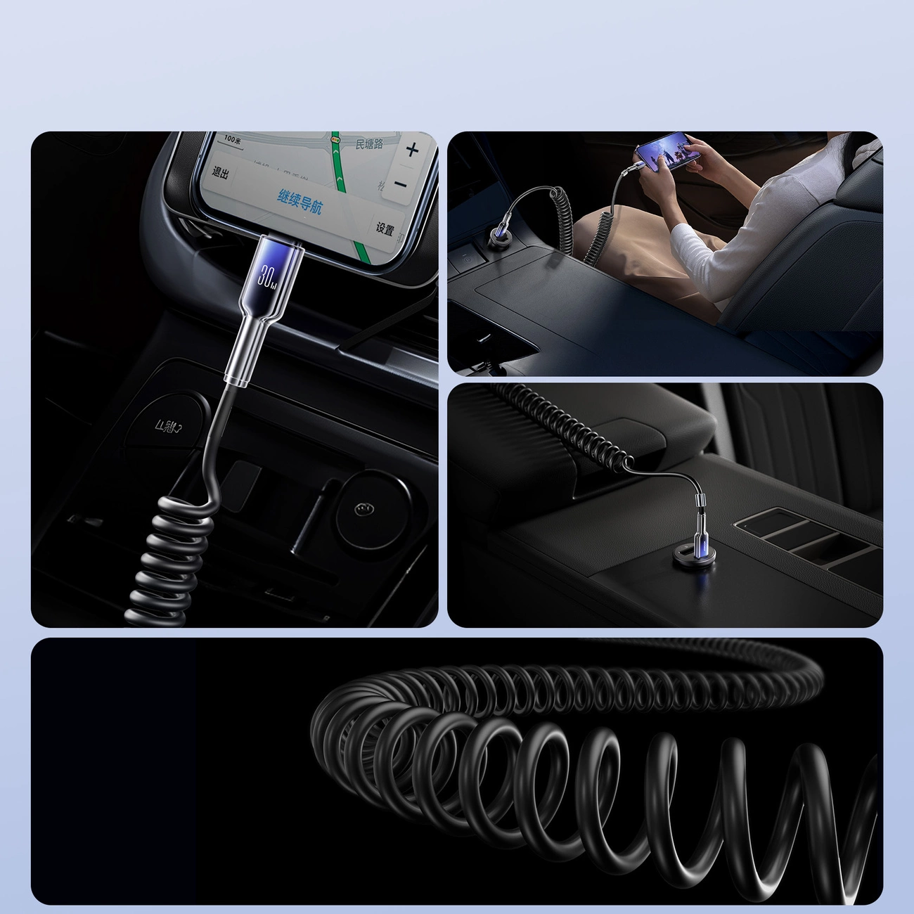 The spiral design prevents cable tangling and facilitates use at home, office, or in the car.