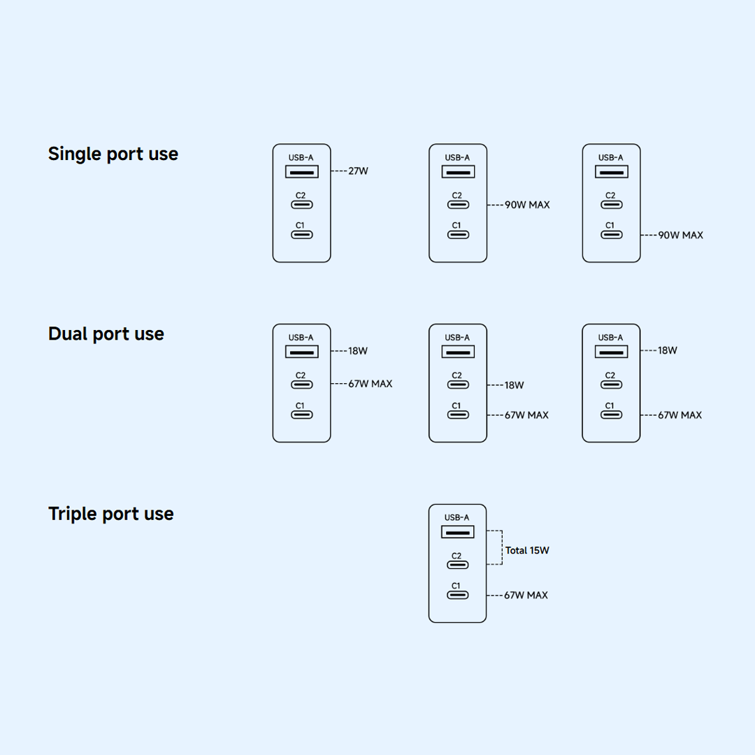 Xiaomi 90W HyperCharge is a high-performance network charger with three ports: two USB-C and one USB-A. Each USB-C port can deliver up to 90W,