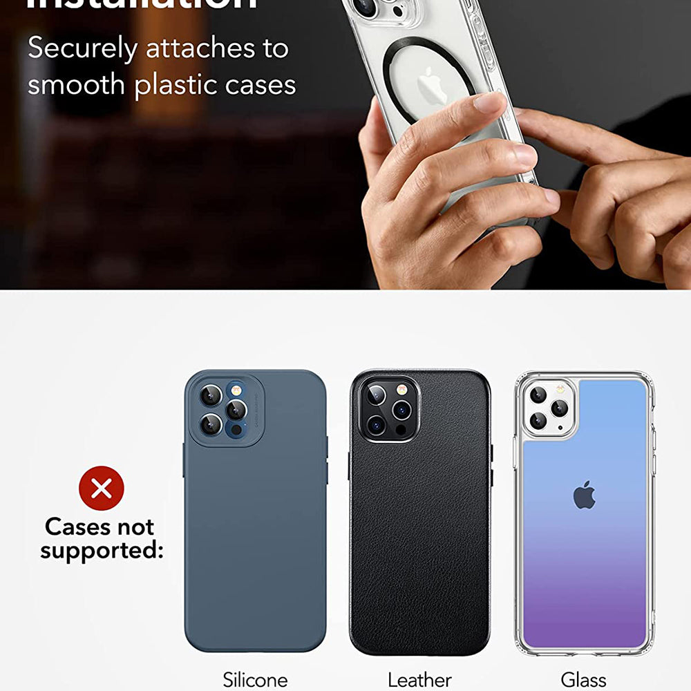 • Preferisci un certo modello di custodia, ma questa non dispone di un anello MagSafe? Non è un problema. Puoi attaccarlo tu stesso. Ordina l'anello magnetico ESR e hai la libertà di scegliere la custodia desiderata.
