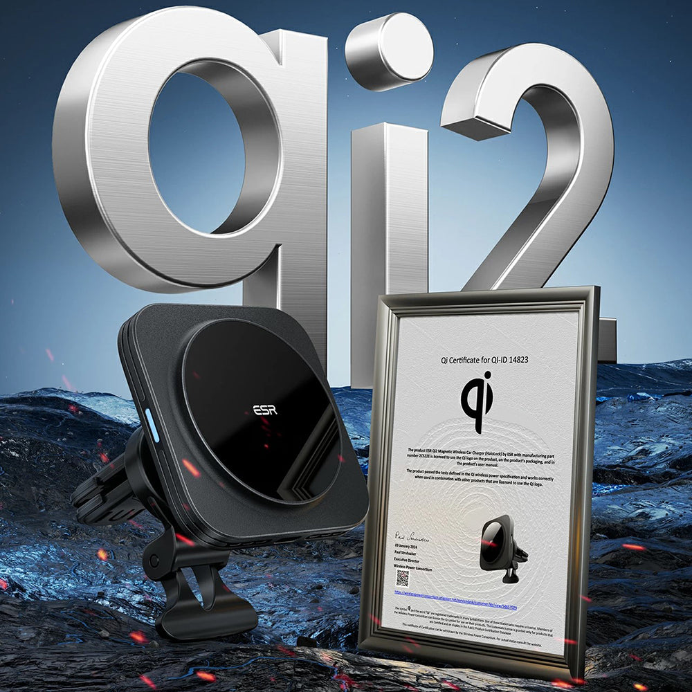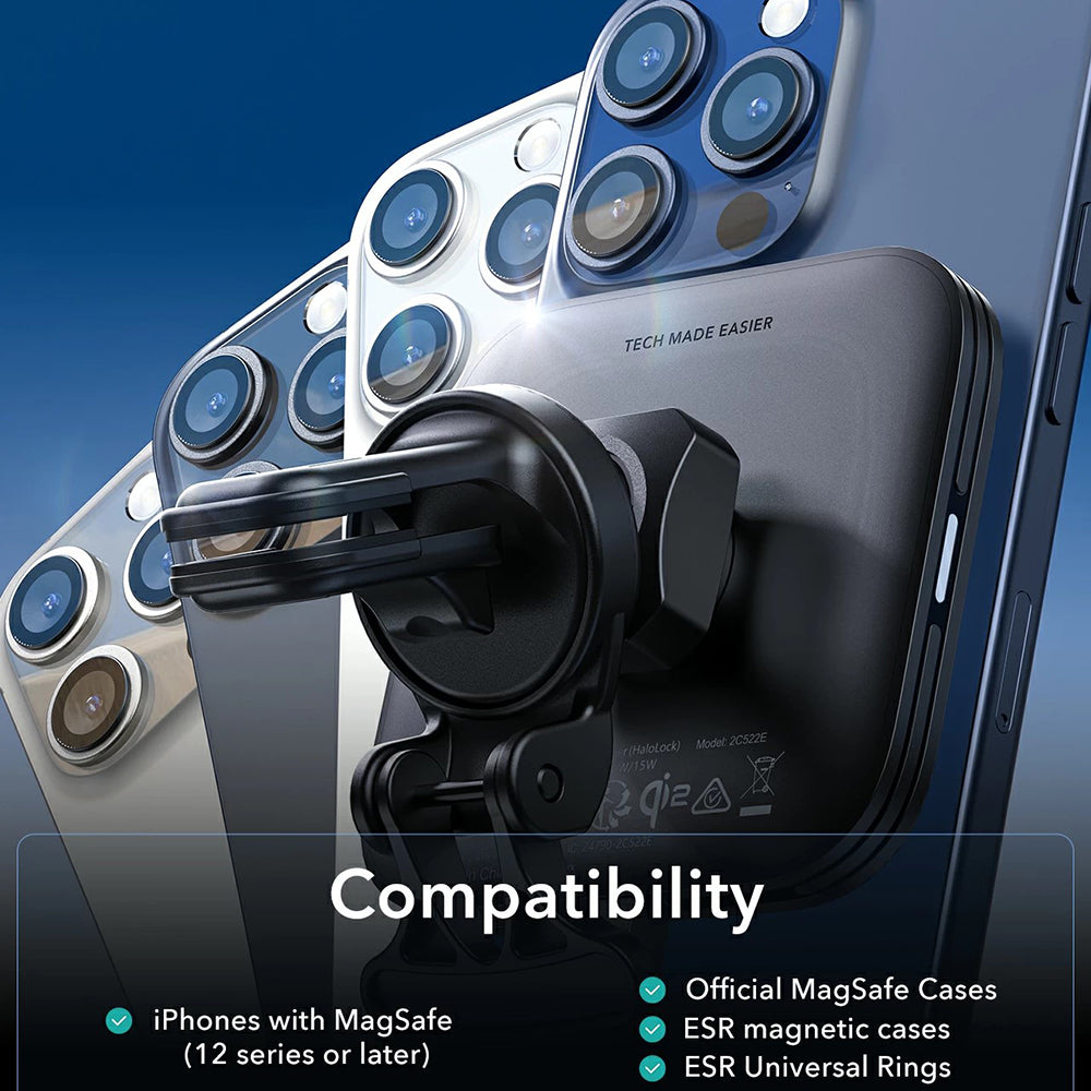 Halolock QI2 è allo stesso tempo un supporto stabile e un caricatore senza fili che può essere montato sulla griglia di ventilazione o sul cruscotto dell'auto.