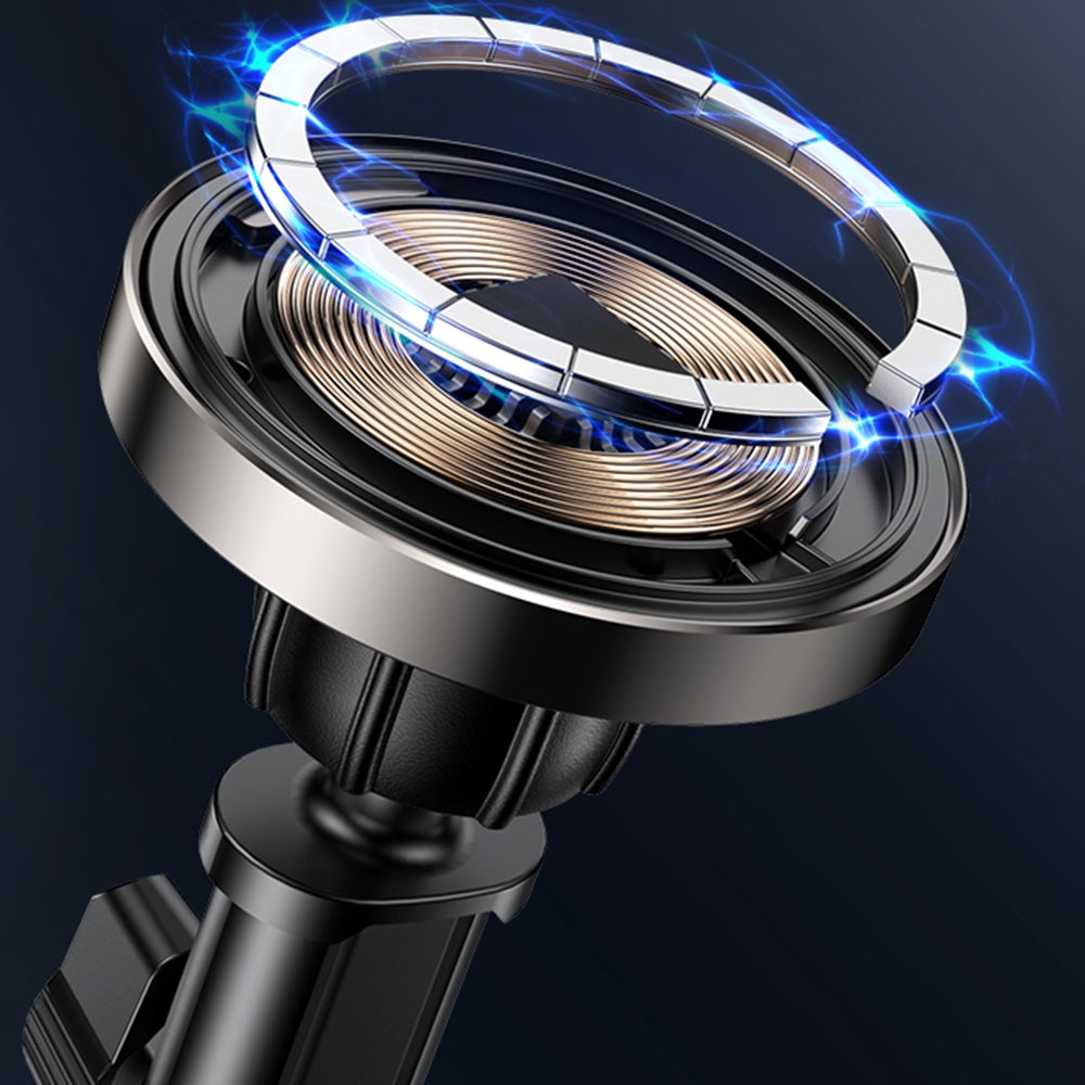 Supporto auto con presa stabile, rotazione completa a 360 e pannello magnetico staccabile che può essere utilizzato anche come caricabatterie wireless da scrivania.