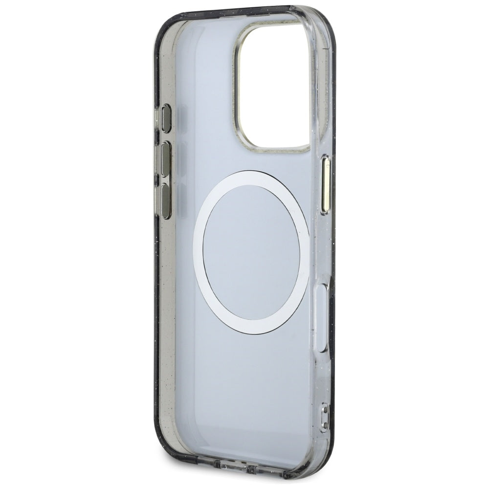 Custodia MagSafe per Apple iPhone 16 Pro Max, Guess, IML Metal Glitter Flowers Triangle, Nera