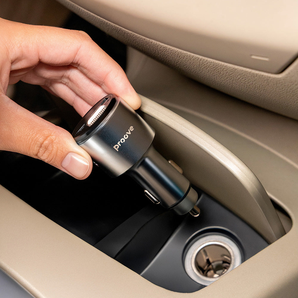 Imposta la frequenza radio su 85.7FM e ascolta le tue canzoni preferite. I lunghi viaggi non saranno più noiosi con il modulatore e caricabatterie auto Proove.